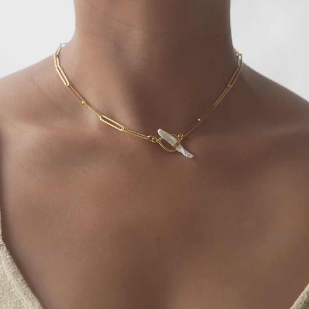 A delicate gold chain with pearl on the clasp. Versatile piece.