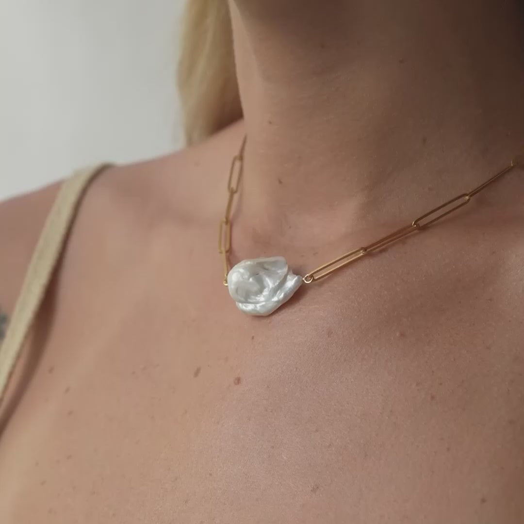 A statement piece — handcrafted golden link chain with exquisite baroque pearl pendant.